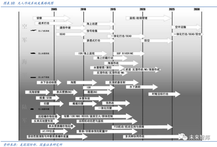 2018 年 8 月 30 日,美国防部发布《2017-2042 财年无人系统综合路线图》,作为美国 第五版《无人系统综合线路图》,反映出美军无人装备发展正进入高效提升整个谱系能力、 全面推进概念技术融合、逐步推动装备更新拓展的“三管齐下”的新时期。据美国无人 作战系统发展路线图,我们可以看到军用无人机、军用无人地面车辆,军用水下潜器等 装备在一体化打击、多兵种协同作战、无人运输等方向仍有较大的发展潜力。