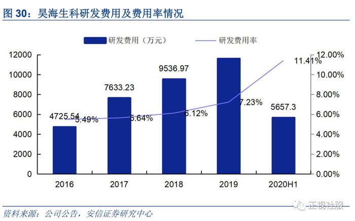 2020年上半年,昊海生科的研发费用为5,657.30万元,较上年同期增加525.39万元,增幅为10.24%。研发费用占营业收入比重由上年同期的6.53%增长到本期的11.41%。