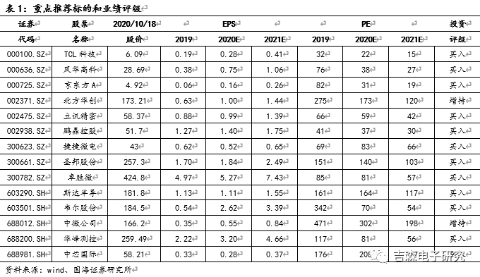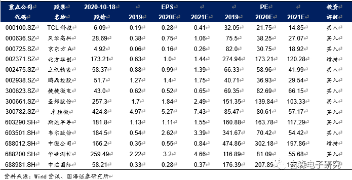 重点推荐:京东方A、TCL科技、立讯精密、鹏鼎控股、北方华创、华峰测控、中芯国际、斯达半导、捷捷微电、风华高科、韦尔股份、圣邦股份、卓胜微;受益标的:中微公司、澜起科技、芯朋微、兆易创新、澜起科技、柏楚电子、深南电路、锐科激光、三安光电、歌尔股份。