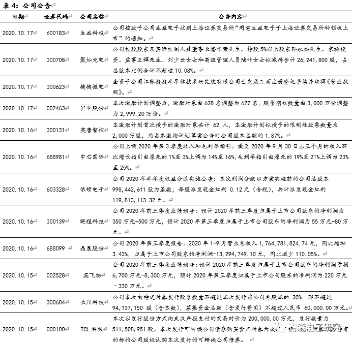 台积电上调全年行业增速指引,半导体景气周期仍将持续。台积电作为全球晶圆代工龙头,是整个晶圆代工行业发展的风向标。研发方面,公司3nm和4nm制程进展顺利,预计均将于2022年量产;公司将全年Capex预期上调至170亿美元,预示下游5G手机和HPC对先进制程的需求将持续旺盛;市场空间方面,公司将2020年晶圆代工行业的增速预测调升至20%,预示着半导体产业景气度仍将上行。过去数十年全球半导体行业遵循摩尔定律螺旋上升,本轮上行周期的根本动力来源于5G、AI、IOT等技术变革,当前时间点我们重点推荐受华为、中芯事件影响较小的功率半导体和部分模拟芯片领域,重点推荐:斯达半导、捷捷微电、韦尔股份、卓胜微,受益标的:芯朋微、华润微、新洁能、澜起科技等。消费电子方面,本周标配5G的iPhone12系列正式发布,预售首日即售罄,苹果手机5G换机需求有望集中释放。新款iPhone不再附送充电头和有线耳机,将进一步促进TWS耳机和充电头需求。我们推荐受苹果新机发布提振的苹果产业链核心公司,重点推荐:鹏鼎控股、立讯精密,受益标的:歌尔股份等;面板行业,我们认为随着疫情冲击逐步消散,面板价格将持续回暖,同时韩厂产能持续退出,产业资源加速向大陆面板龙头厂商集中,我们重点推荐:京东方A、TCL科技。