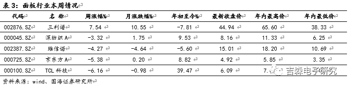 面板:本周面板行业,国内上游偏光片厂商三利谱上涨7.54%,LCD用偏光片代表的企业深纺织A下跌3.32%。我们认为,下游需求的大幅收缩将对面板厂商短期内的业绩造成影响,但从供给端以及LCD整体产业竞争格局来看,中国大陆面板厂商在出货面积的市场份额一直持续稳定提升,此前三星显示已表示将在2020年内关停所有LCD产线,若中国大陆厂商承接了韩系面板退出的份额,预计2020年中国LCD出货量占比将从约50%提升至60%-70%。我国大陆面板厂商在LCD液晶面板的龙头地位将得以巩固,目前随着国内疫情不断好转,我国面板在供给端已经逐渐恢复,其业绩表现将取决于未来全球疫情结束及下游市场回暖时间。
