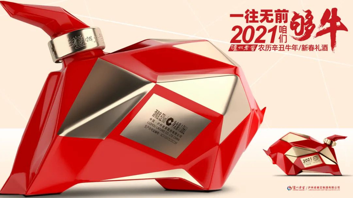 “整体产品从头、背、尾的设计上,体现了一个力量的封存感,表达‘牛’转乾坤之意,冲击感更强,红色、金色的拼接碰撞,呈现出极强的力量感,有‘石破天惊’的意象。”泸州老窖定制酒公司内部人士向酒业家透露了该产品的设计初衷与寓意,“2020的疫情让国民见证了大国力量,2021年我们以‘够牛’精神,“一往无前”的气势,致敬大国之势,整体向世界传递中国力量和自信,携手同心,攻坚克难。”