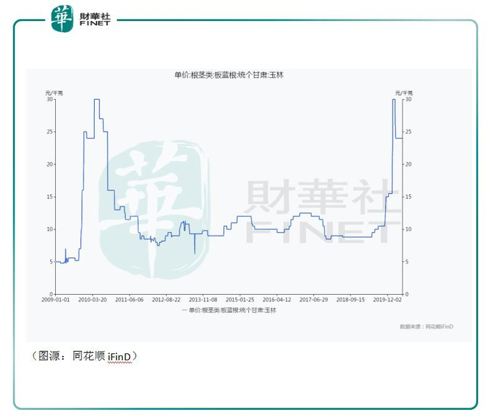 近十年板蓝根的两个价格高峰(下图为板蓝根采购价,成品零售价亦会对应上涨)分别是09年到10年初的甲流及今年年初的新冠肺炎。但板蓝根价格高位维持的时间相对会较短,且不同流行病毒之间相距的时间较长,平常时间价格主要在10元/千克上下徘徊。