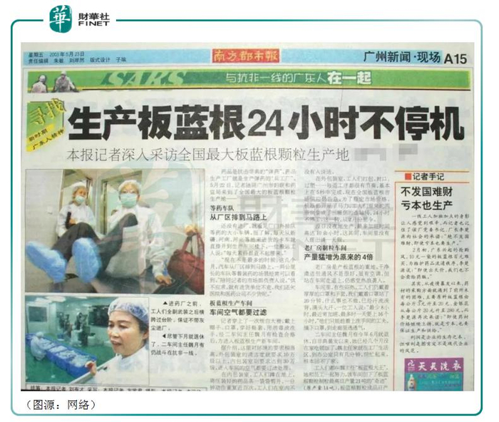 一时之间,板蓝根成了民众的心灵解药。白云山药厂门前购药人群的队伍连绵了三公里。药厂24小时不停机生产板蓝根,还登上了地方报纸。