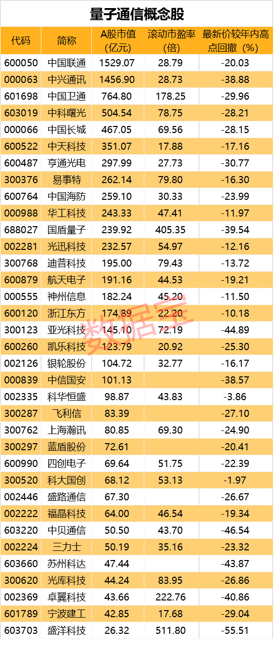 根据证券时报·梳理,A股中量子通信概念股共35只。总市值规模达到8736.49亿元,其中中国联通和中兴通讯的市值均达到千亿级别,市值分别为1529.06亿元和1456.9亿元。