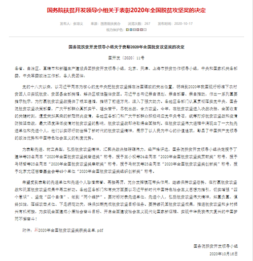 《国务院扶贫开发领导小组关于表彰2020年全国脱贫攻坚奖的决定》高度评价黄文仔董事长等获奖者:“他们以实际行动诠释了新时代的脱贫攻坚精神,展示了以人民为中心的价值追求,彰显了中国共产党领导的政治优势和中国特色社会主义的制度优势。”
