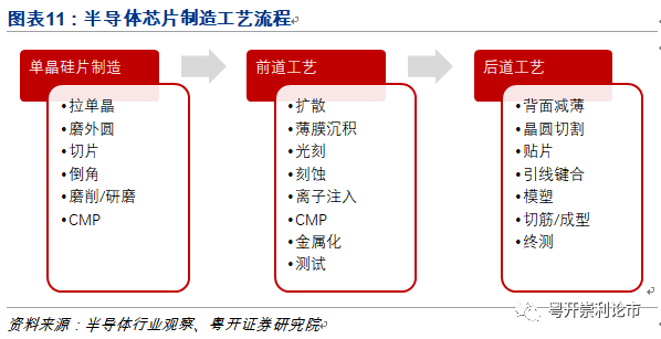 IC制造将设计好的电路图转移到硅片等衬底材料上,输出结果为含有芯片的晶圆。制造工艺流程包括单晶硅片制造、前道工艺以及后道工艺,步骤繁杂,少则几百步,多则上千步,时长以月为单位。