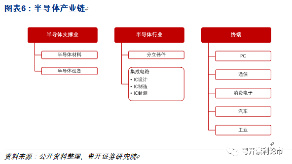 半导体产业链上游为支撑业——材料和设备;中游是半导体生产的三道工序——设计、制造以及封测;下游是各种终端产品,如通讯设备、消费电子、汽车、工业等。