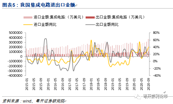 进出口数据表明我国集成电路国内自给率较低,国产替代空间广阔。据中国海关数据统计,2019年我国芯片的进口金额为3040亿美元,出口额1017亿美元,贸易逆差超过2000亿美元,自给率较低。据2020年8月4日国务院发布的《新时期促进集成电路产业和软件产业高质量发展的若干政策》,目标到2025年芯片自给率由目前的30%提高至70%,国产替代空间广阔。