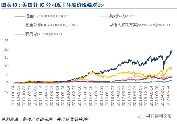 借鉴美国发展经验,定位不同赛道的龙头公司发展速度各不相同。如定位手机处理器芯片和射频芯片的高通、Skyworks过去十年分别取得了1.5倍和9.3倍的增长;定位通讯芯片的博通取得19.2倍增长;定位存储芯片的美光取得3.7倍增长;定位FPGA,模拟芯片的赛灵思获得3.6倍增长。