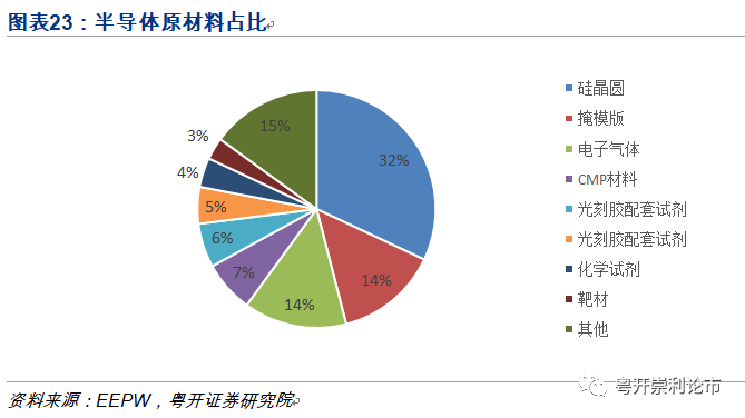 根据半导体芯片制造过程,一般可以将半导体材料分为基体、制造、封装三大类:其中基体材料包括硅晶圆、硅基材以及化合物半导体;制造材料包括光刻胶、抛光材料、掩模版、特种气体等;封装材料包括键合丝、陶瓷封装材料、芯片粘结材料等。其中硅晶圆、掩模版、电子气体占据市场份额较大。