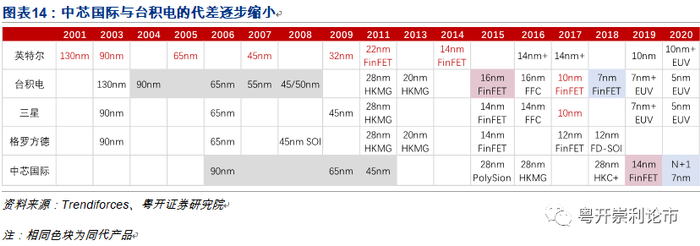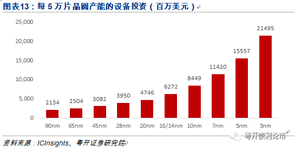 (2)资本投入方面,由于制造产业需要持续高投入,资本开支的80%用于购买设备,且每代节点的资本投入增速为30%,因而玩家数量逐步减少。以台积电为例,150亿美元Capex中,约120亿美元用于采购先进工艺设备。联华电子、格芯在14nm节点退出后,10nm以下玩家只剩下台积电、英特尔、三星,以及追赶中的中芯国际。
