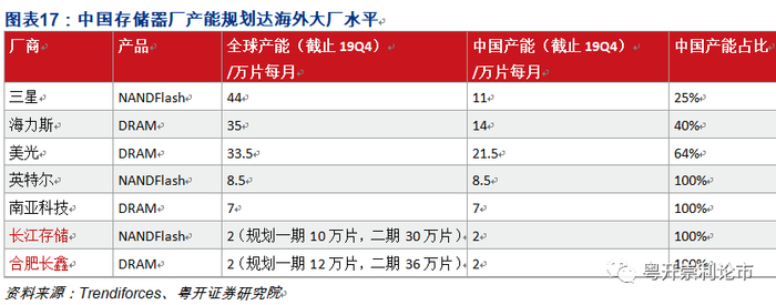 (2)存储器企业方面,以长江存储、合肥长鑫等为主的存储器厂商产能布局已达到海外大厂水平。合肥长鑫作为DRAM国产替代龙头,1xnmDDR4产品已上市销售,与国际领先水平仅相差一代;长江存储为NANDFlash国产替代龙头,64层产品已出货,128层NANDFlash有望突破,将达到国际水平。