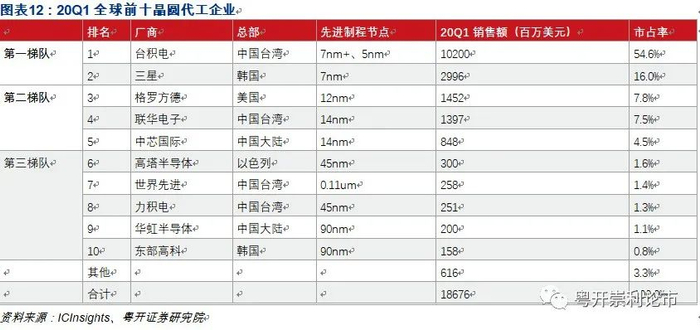 晶圆代工行业呈明显的寡头垄断特征。由于技术、资本和人才密集,市场集中度较高。根据ICInsights统计,20Q1前十大纯晶圆代工厂商占全球市场97%的市场份额,前五大厂商(台积电、三星、格罗方德、联华电子、中芯国际)占全球市场90%的市场份额。