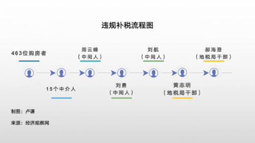 从2016年9月第一单算起,至2017年3月初,5个多月的时间里,周云峰通过刘勇、刘航,到黄志明、郝海澄这个链条,共违规为463名没有北京户口的人,办理了补缴五年个人所得税业务,其中有375人通过购房资格审核;这些人里,又有328人在北京购买了房产。
