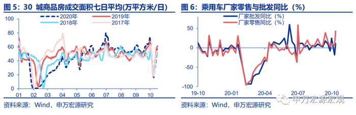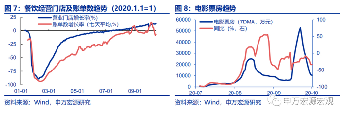 1)假期延长的影响趋于结束,地产销售同比降幅收窄。较10月9日同比降幅收窄14.5个百分点至-4.8%。2)乘用车零售、批发量同比大幅上行。10月11日当周,厂家日均零售和批发同比增速分别上行37.0和29.0个百分点至43.0%和11.0%。3)餐饮门店数高位稳定、账单数季节性下降。营业门店增长率上行0.6个百分点至12.6%,而账单数增长率(七天平均)较10月9日下降15.2个百分点至-7.2%。4)假期结束,电影票房同比下降。截至10月15日,电影票房(七天平均)为10839.7万元,较10月9日同比下行17.8个百分点至-33.2%。