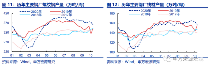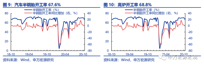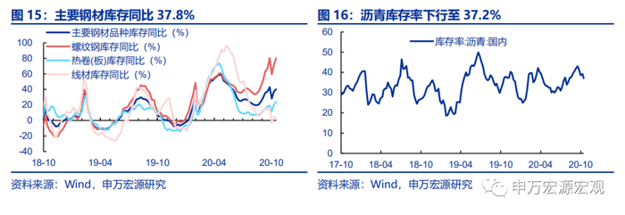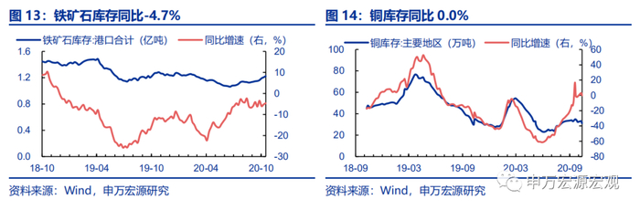 1)开工率保持高位。10月9日当周高炉开工率上行0.7个百分点至68.8%,10月16日汽车半钢胎开工率小幅下行3.1个百分点至67.6%。2)钢材产量在节前高增的背景下大幅回落。10月9日当周,螺纹钢周产量360.8万吨,同比下行13.9个百分点至5.3%。线材产量157.6万吨,同比下行10.7个百分点至1.8%。3)铁矿石与钢材库存小幅上行而铜库存保持高位。10月16日当周,铁矿石港口库存同比增速上行0.6个百分点至-4.7%;主要钢材库存同比上行2.5个百分点至40.2%,其中螺纹钢(上行7.7个百分点)和热轧卷板(上行3.0个百分点)是钢材库存上行的主要动力;主要地区铜库存小幅回落3.1个百分点至0.0%,但仍保持高位。