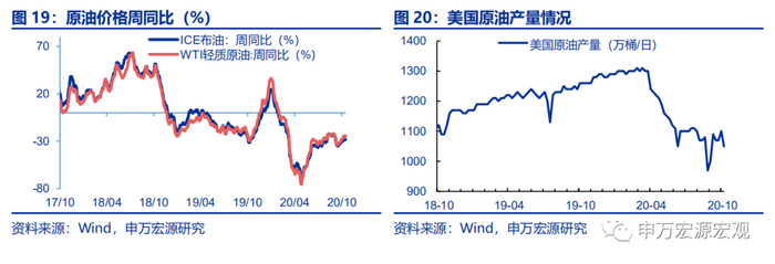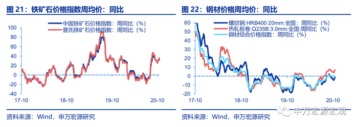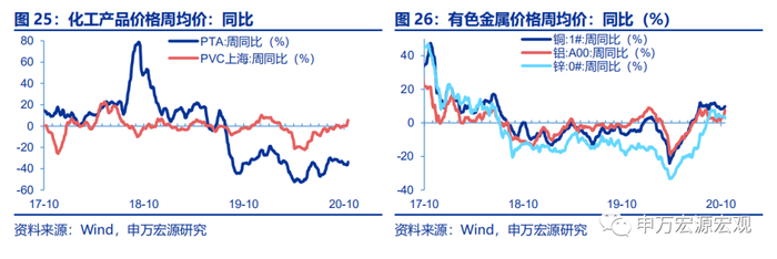 1)原油价格基本稳定,同比小幅下降。截至10月16日, ICE布油和WTI 轻质原油周均价同比降幅分别扩大0.6和0.5个百分点至-28.3%和-24.6%。2)铁矿石价格高位,钢材价格上涨。截至10月16日,中国铁矿石价格指数周均同比上行2.6个百分点至33.3%;普氏铁矿石价格指数周均价同比上行3.4个百分点至36.3%;螺纹钢同比上行1.7、1.4个百分点至-1.3%和7.0%。3)煤炭价格上涨,水泥小幅上行。秦皇岛Q550动力煤周均价同比上行2.1个百分点至6.1%;华东地区1/3焦煤和山西二级冶金焦周均价同比上行0.9和2.8个百分点至-16.1%和5.7%;水泥价格全国指数同比小幅上行0.2个百分点至-1.4%。4)化纤上涨,有色金属分化。CCFEI价格指数PTA内盘周均价同比降幅收窄2.4个百分点至-33.6%;铜#1、铝A00、锌#0长江周均价分别同比上行1.3、3.9和下行1.0个百分点至9.8%、7.5%和2.8%。