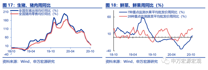 1)猪肉供需继续改善,生猪、猪肉价格同比增速均维持下行。9月23日当周,全国生猪平均价35.2元/公斤,环跌2.5%,同比增速下行5.7个百分点至26.5%。10月7日当周,全国猪肉零售价52.2元/公斤,环跌3.6%,同比增速下行5.7个百分点至20.3%。2)鲜菜鲜果价格同比下行。截至10月16日,蔬菜价格较周同比下行1.0个百分点至24.4%。7种水果平均批发价周同比下行0.3个百分点至3.4%。