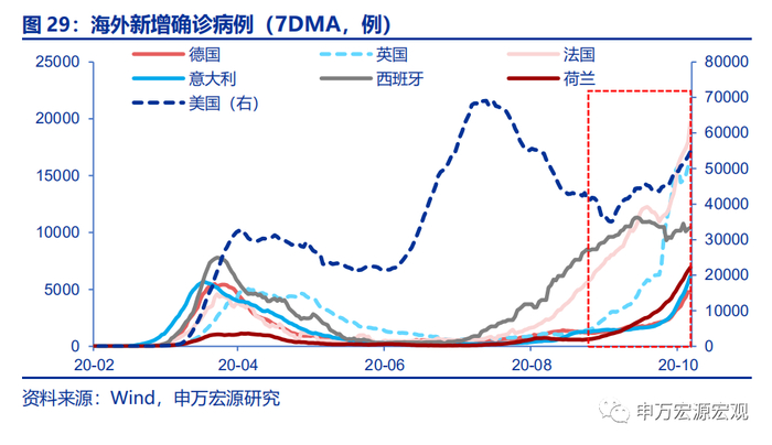 欧洲疫情爆发势头难以遏制,多地政府加强防控措施,欧元、英镑对美元贬值,美元指数回升。截至10月15日,英国、法国、西班牙新增确诊人数(7天平均)均超过1万人,法国接近2万,疫情爆发势头难以遏制,多地政府宣布进入紧急状态,采取宵禁、限制客流量等防控措施,或影响欧洲经济恢复进程。10月16日欧元、英镑兑美元分别较10月9日贬值0.9%和1.0%,美元指数报收93.7064,较9日升值0.7%。