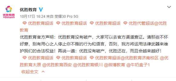 优胜教育近日被媒体曝出北京总部人去楼空已无人办公,疑似跑路。随后优胜教育于10月17日发出官方声明,称自己没有破产,大家可以去官方渠道查证。