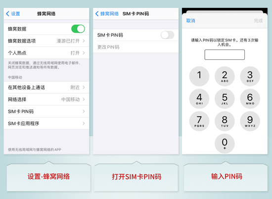 由于输错三次手机卡会被锁定,设置时要特别注意看清提示输入的是“现在的PIN码”还是“新的PIN码”。下面以安卓和苹果手机分别做示例:
