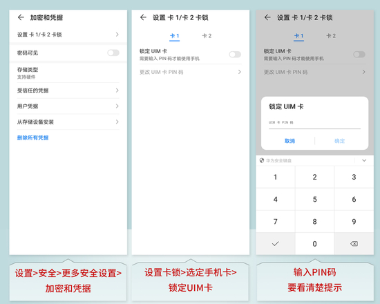 安卓手机:以华为Mate30为例,点击“设置”,进入“安全-更多安全设置-加密和凭据-设置卡锁-选定手机卡-锁定UIM卡”,即可设置PIN码。