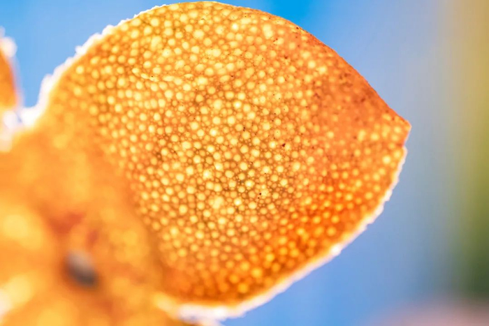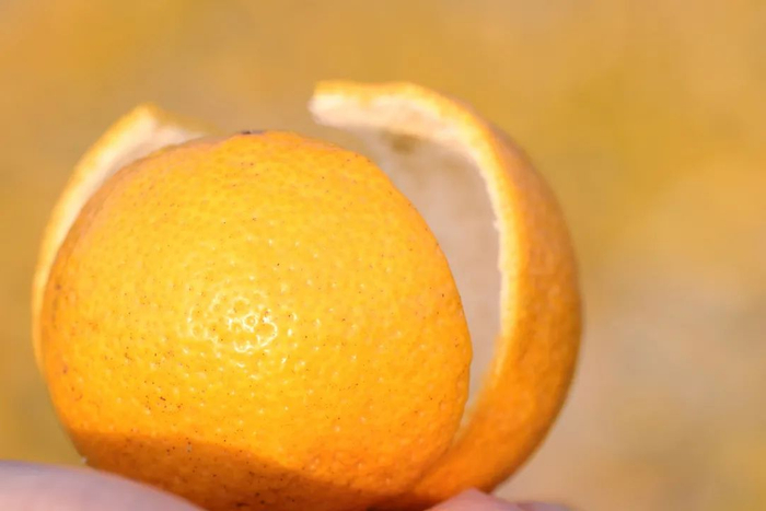 茶枝柑油芳香浓郁,油室均匀密布,油窝明显,老树柑的挥发油含量高,皮薄香浓,甘韵悠长。
