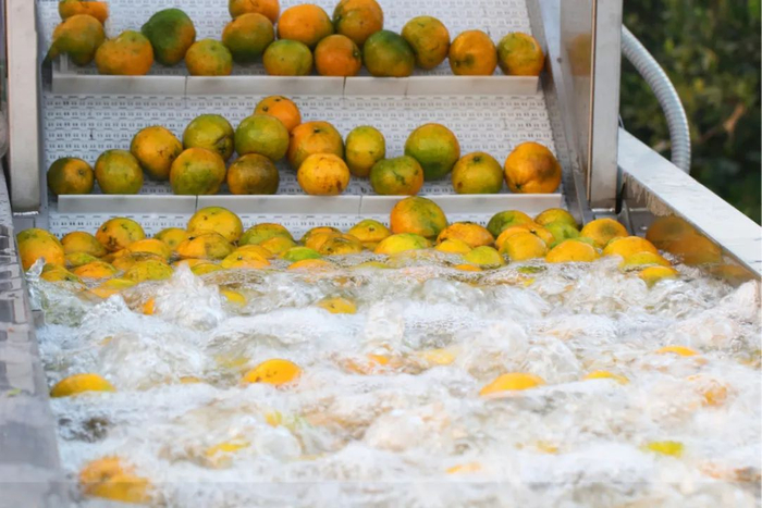 摘来的柑果清洗去尘,采用机器气泡、臭氧清洗,确保干净整洁。