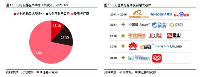 客户资源方面,目前在国内市场,云计算厂商、互联网巨头为 IDC 增量市场的需求主力。中信证券认为,万国数据已经和国内主要云厂商、互联网巨头达成了稳固的合作关系:截至2020Q2,公司71.8%的收入来自云厂商,17.1%来自大型互联网公司。良好的客户基础有望为公司中长期的资源扩张、业务增长提供基础支撑。