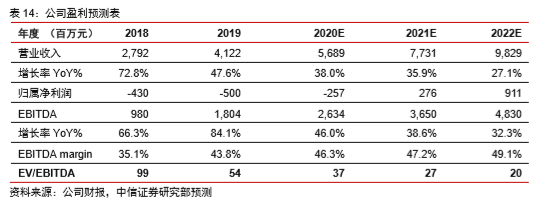 中信证券表示,综合上述核心判断,预计公司 2020-2022 年营业收入 56.9/77.3/98.3 亿元,对应增速 38.0%/35.9%/27.1%。