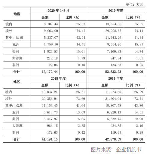 根据详细的市场情况来看,九州风神2017-2020年3月,欧洲业务收入占总业务收入的比例为43.86%、41.64%、41.64%、43.04%,欧洲业务收入占比均超过四成,远高于境内业务收入,九州风神在招股书中解释为自身在欧洲区域内多年的渠道深耕。