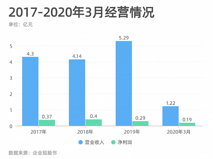 根据招股书,九州风神在2017年-2020年3月营业收入分别为4.3亿元、4.14亿元、5.29亿元、1.22亿元。在2017-2019年期间,实现了整体上的收入增长,三年的营业收入复合增长率为 10.88%。