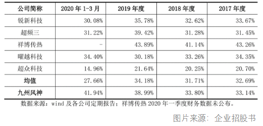 根据招股书中提及的可对比同行业公司的综合毛利率来看,九州风神在2017年-2020年3月此期间的综合毛利率均高于行业均值,而对比行业内企业来说,综合毛利率也处于高位水平。