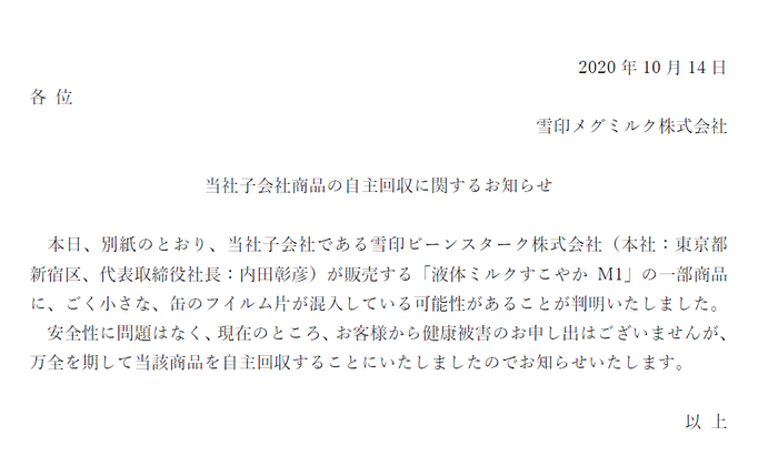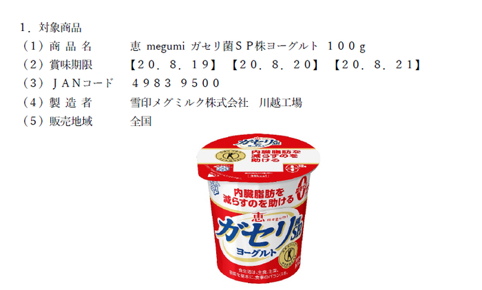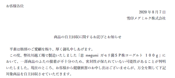 2020年8月7日,雪印乳业株式会社对其川越工厂生产的3批次“恵 megumi”酸奶(100g/杯,2020年8月19日-21日)启动召回,理由是部分产品盖子粘结不充分,可能无法保持密封性。这也意味着3个月时间里,雪印乳业已实施了两次问题产品召回。