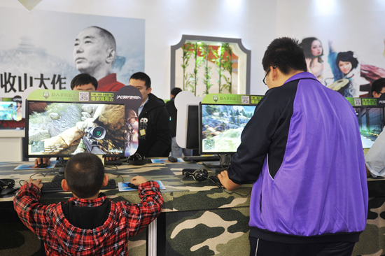 2013年10月13日,北京,在第十一届中国国际网络文化博览会的展区里,两个年龄差异显著的观众正在试玩网络游戏。视觉中国供图