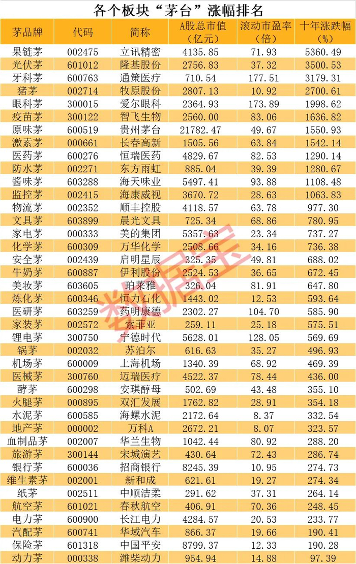 A股各板块“茅台”名单:十年十倍股集中营 持续高成长股仅13只