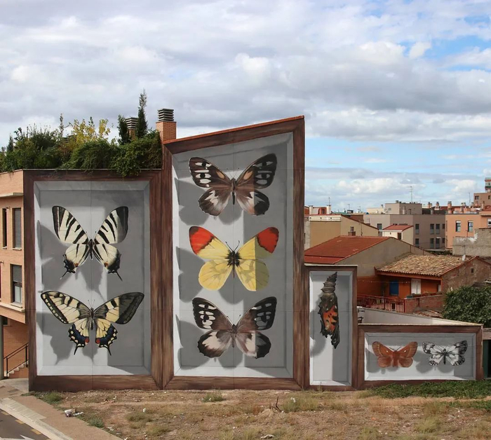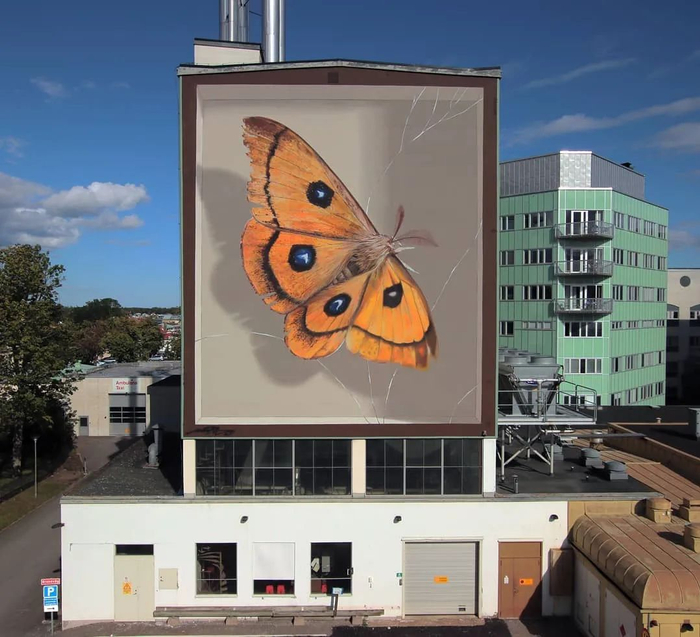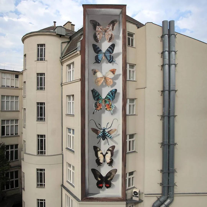 巨大的蝴蝶停留在高高的楼层墙面上,无论是花纹的样式,翅膀的质感还是阴影和留白,都和博物馆里展出的蝴蝶标本一模一样: