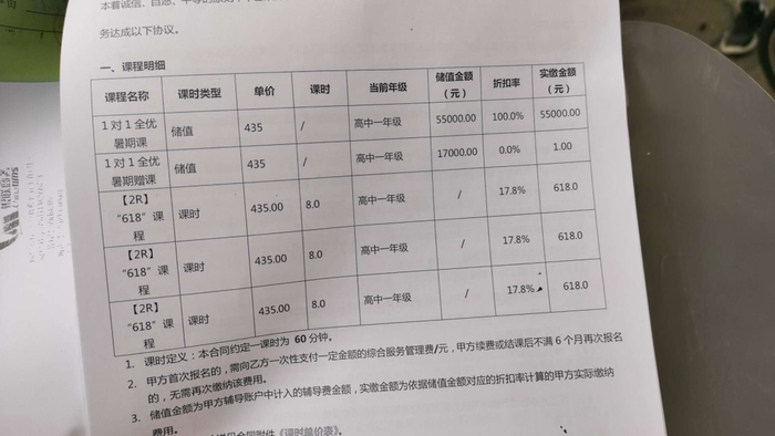 从这些家长购买的课程合同可知,优胜高一1对1全优课程1课时单价为435元/课时,在实际支付的过程中,会有一些赠送课程和折扣课程。平均单价也在200元/课时以上。有家长购买的1对2全优课程,单价为334元/课时。