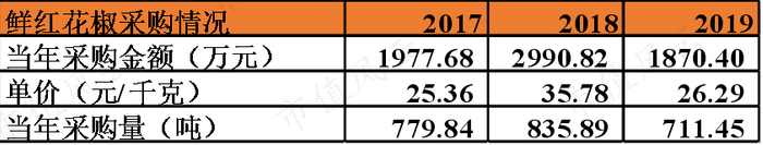 另外计算得出,公司在2018年鲜红花椒的采购量较去年同期增长了7.1%,在2019年则同比减少14.9%。