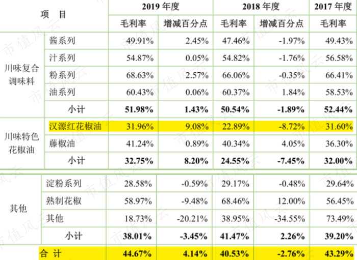 从具体产品来看,2018年,公司绝大部分产品的毛利率均有不同幅度的下跌。其中,汉源红花椒油的毛利率在同比下跌8.7个百分点至22.9%,成为当年公司毛利率下跌百分点最多的细分产品。