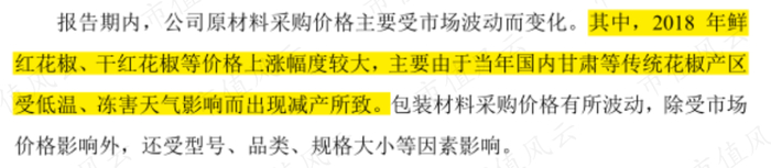 公司披露称,2018年花椒采购金额大幅上涨的原因,主要是当年受甘肃等花椒传统产区因低温冻害天气减产的影响,花椒市场价格涨幅较大。