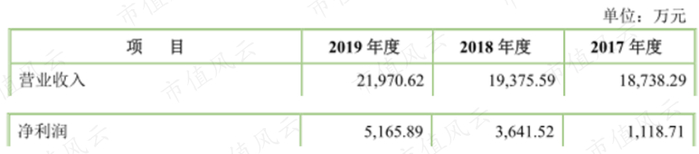 2017年、2018年和2019年,公司的营业收入分别为1.87亿元、1.94亿元和2.20亿元;净利润分别为1119万元、3642万元和5166万元。
