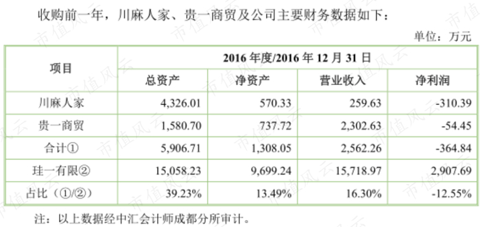 披露显示,在收购发生前的2016年,川麻人家的净资产为570万元,营业收入为259.7万元,但净亏损高达310.4万元。