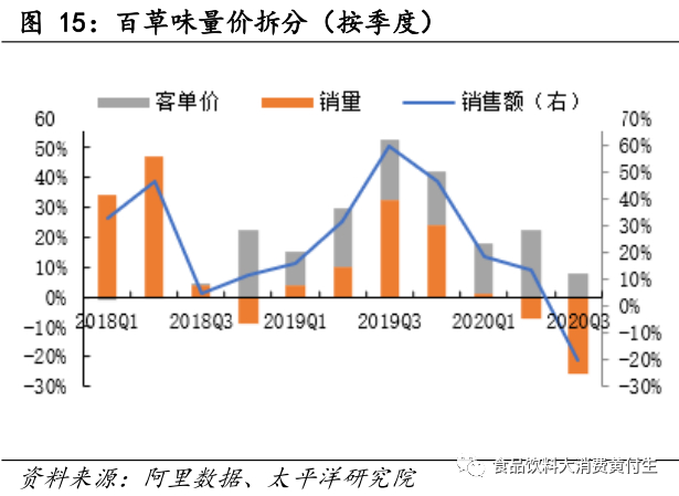 2)百草味2020Q3销售额9.02亿元,同比-20.10%,低于行业36.06pct,其中量增-25.94%,客单价增+7.88%,增长主要由客单价贡献;市占率4.62%,同比-2.09pct。