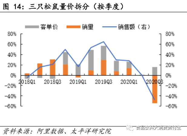 1)三只松鼠2020Q3销售额12.35亿元,同比-47.20%,低于行业63.16pct,其中量增-54.24%,客单价增15.39%,增长主要由客单价贡献;市占率6.33%,同比-7.57pct。