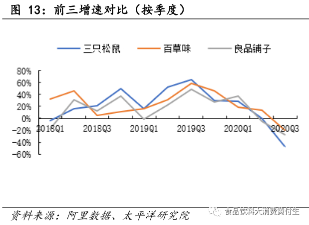 龙头公司来看,三只松鼠/百草味/良品铺子增速均低于行业,我们认为与去年高基数、直播带货下新品牌快速崛起有关。