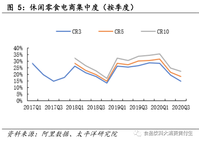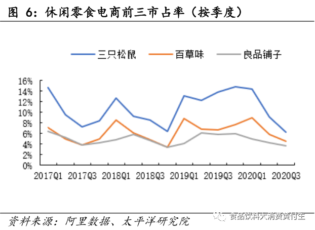 (2)集中度2020Q3三只松鼠市占率6.33%(同比-7.57pct),百草味4.62%(同比-2.09pct),良品铺子3.67%(同比-2.19pct)。