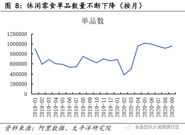 线上参与者大幅增加。(1)品牌数量:线上休闲零食品牌数量总体下降,从2018年1月的3.73万下降至2019年6月的1.77万,下降了52%,后受平台政策倾斜影响,7月开始逐步有回暖迹象。今年2月受疫情及直播带货影响,线上品牌大幅增长,较2020年2月地点增长62%。(2)单品数量:线上休闲零食单品数量持续下降,从2018年1月的92.16万下降至2019年6月的53.28万,下降了42%。后受政策倾斜影响,7月以来也有一定回暖。今年2月受疫情及直播带货影响,线上单品大幅增长,较2020年2月地点增长161%。