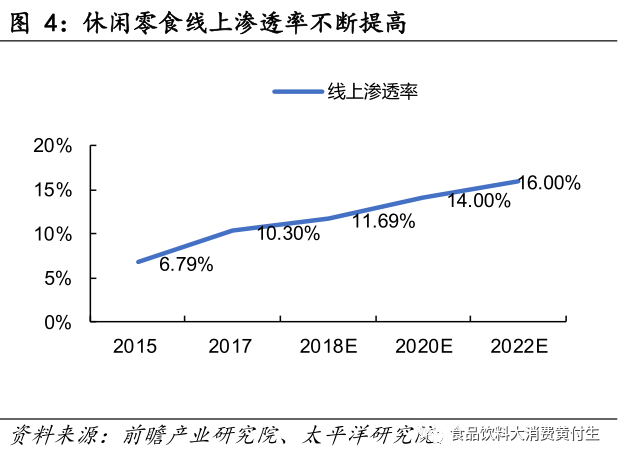 未来线上中高速增长、量价齐升趋势预期可持续。根据贝恩数据,快消品城镇零售渠道销售额增速已从高速增长步入中速增长阶段,以2016年为界,2016年以前增速在30%以上,2016年以后降至30%以下,目前已进入20%增速阶段。展望2020年,我们认为休闲零食线上有望维持在20%+中速增长,量价齐升趋势有望持续。